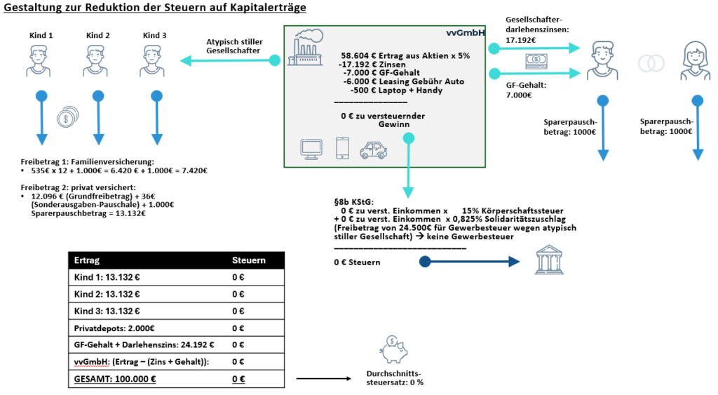 Insgesamt liegen somit in unserem Beispiel Kapitalerträge für die drei Kinder von jeweils 13132€ vor, 2000€ Kapitalerträge in den Privatdepots der Eltern und 58604€ Kapitalerträge in der vermögensverwaltenden GmbH. Dieser Gesamtgewinn in Höhe von 100.000€ wird nur mit lediglich 0€ besteuert. Dadurch ergibt sich eine Gesamtsteuerlast in Höhe von 0%.